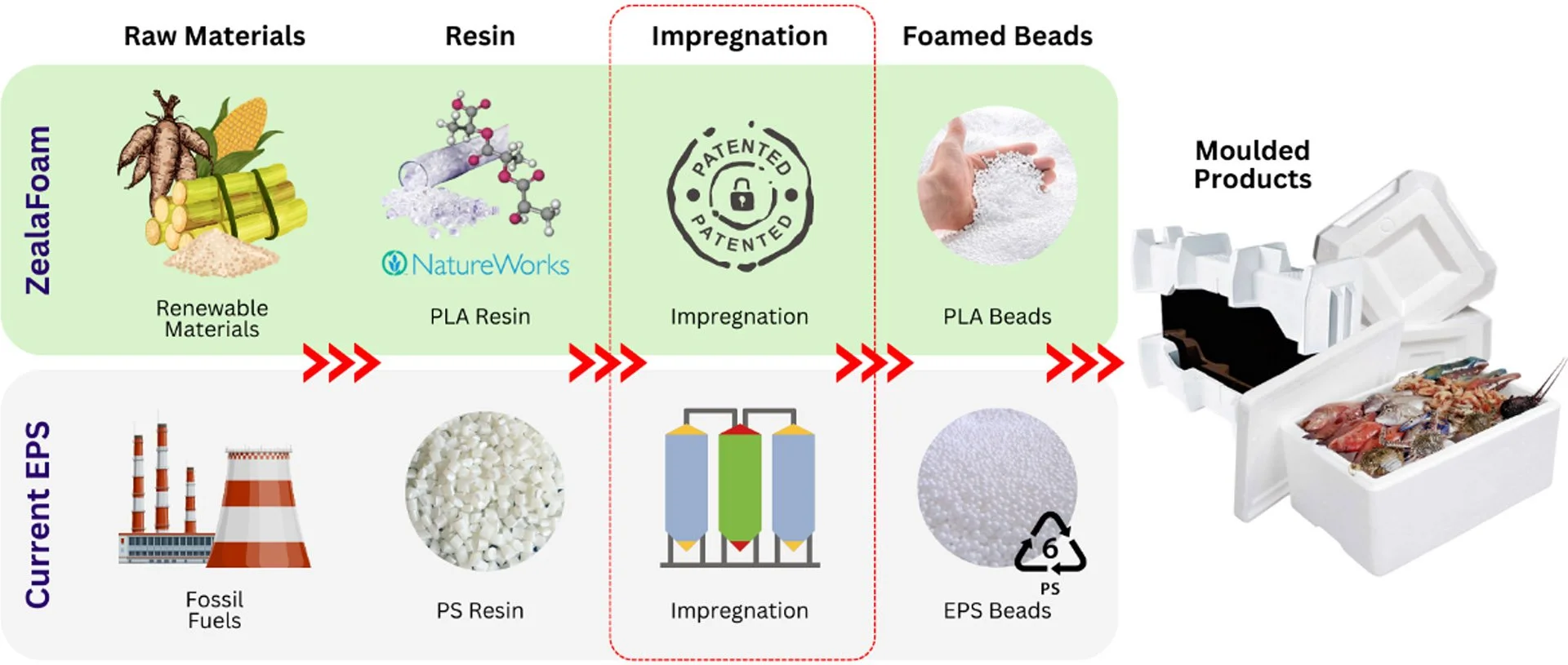Utilising patented technology, ZealaFoam offers a seamless solution, enabling EPS manufacturers to effortlessly produce PLA-based products by substituting the impregnation stage with ZealaFoam's core technology.